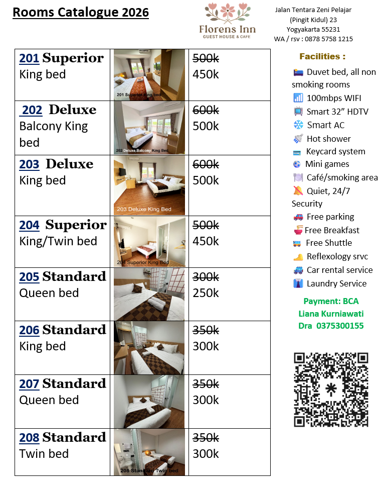 Florens Inn menawarkan konsep penginapan dengan fasilitas hotel berbintang lima seperti: kamar dengan desain modern yang dilengkapi dengan Duvet bed, Blackout curtain, Smart AC, Wi-Fi super cepat 100 Mbps (contohnya film "Deadpool & Wolverine" kualitas HD bisa didownload dalam waktu 5 menit), Smart 32” HDTV (dgn akun pribadi anda bisa nonton Youtube premium dan Netflix), shower air panas tenaga matahari dalam setiap kamar, sistem kunci kartu dan kunci manual tambahan, keamanan 24 jam, kafe, CCTV, layanan laundry, serta penyewaan sepeda/motor/mobil dan tur. https://linktr.ee/florensjogja